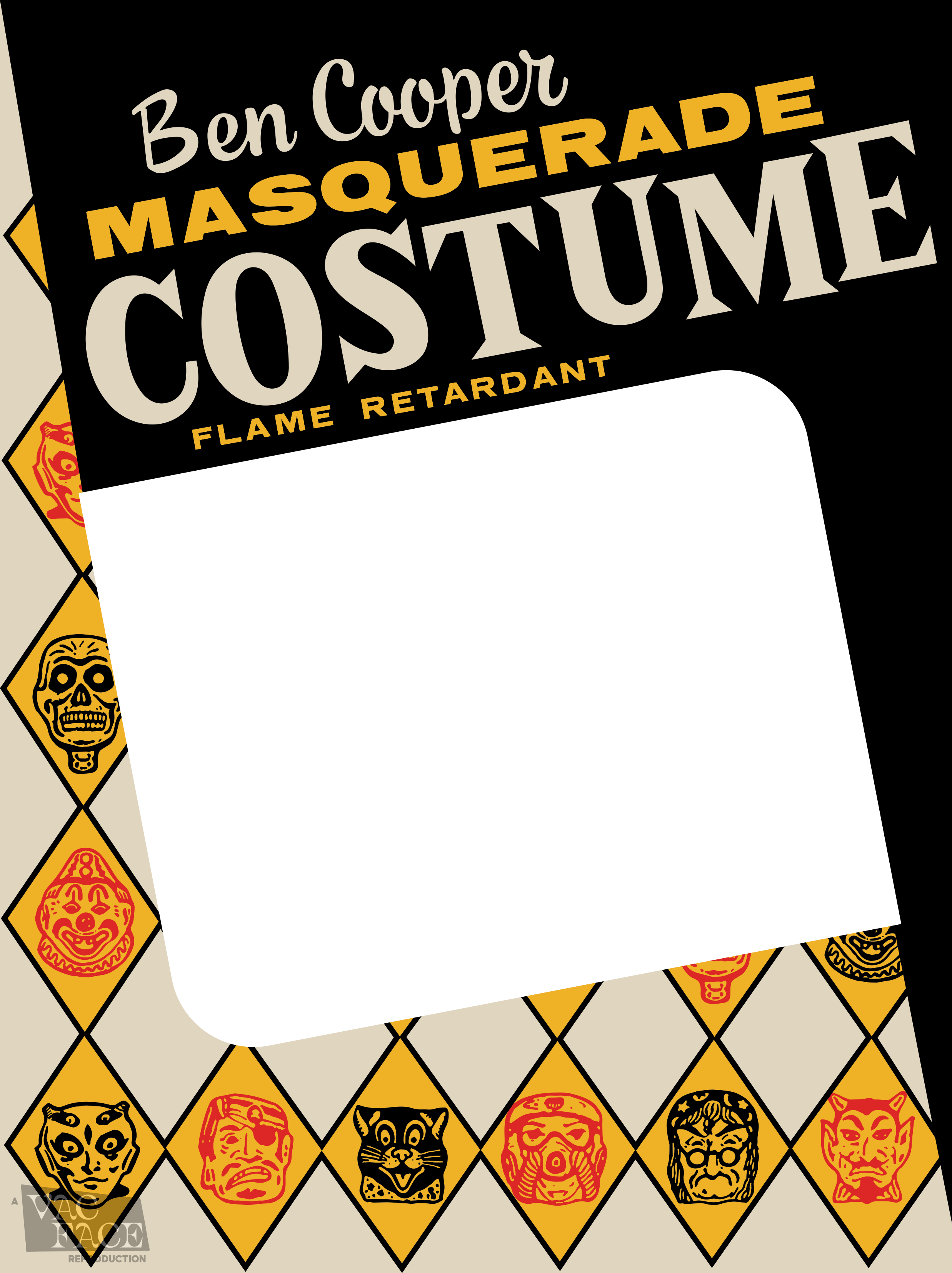 Argyle pattern box with illustrations depicting nine masks that the company produced: Boney the Skeleton, Clown, Moon Man, Pirate, Mr. Jinx/Black Cat, Jet Commander/Space Rocket Commander/Col. McCauley, Winnie the Witch, Devil, and Princess/Fairy (only appears on the side panels).