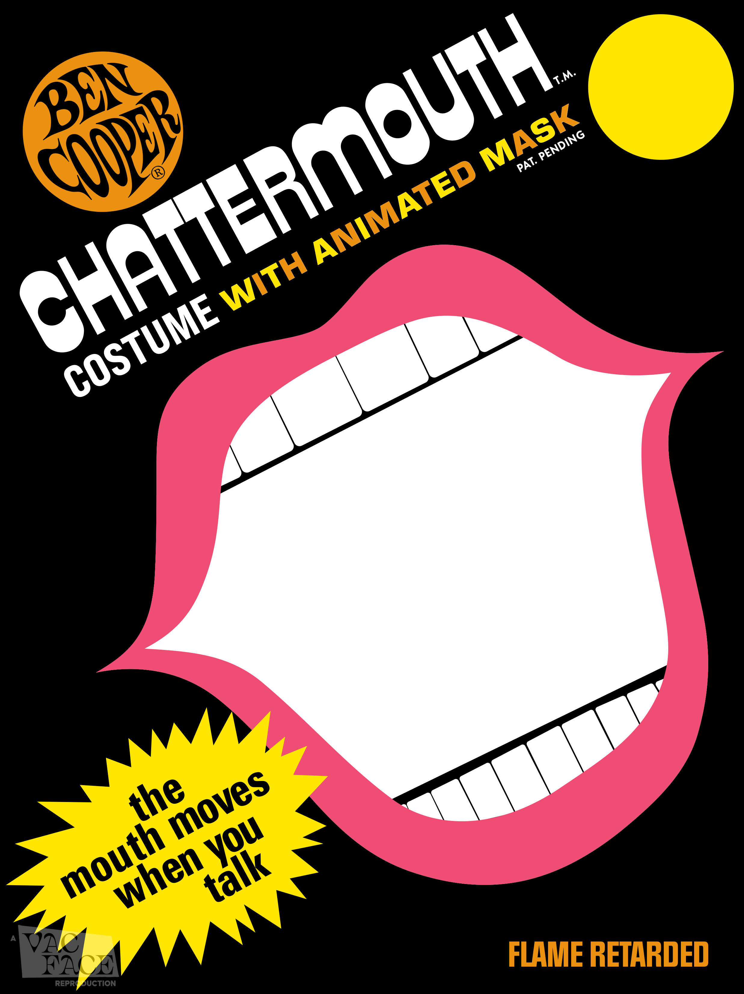 Box for a line of gimmick masks with articulated jaws that were previously called “Moving Mouth” masks (link) before being rebranded as “Chattermouth” masks in 1966.