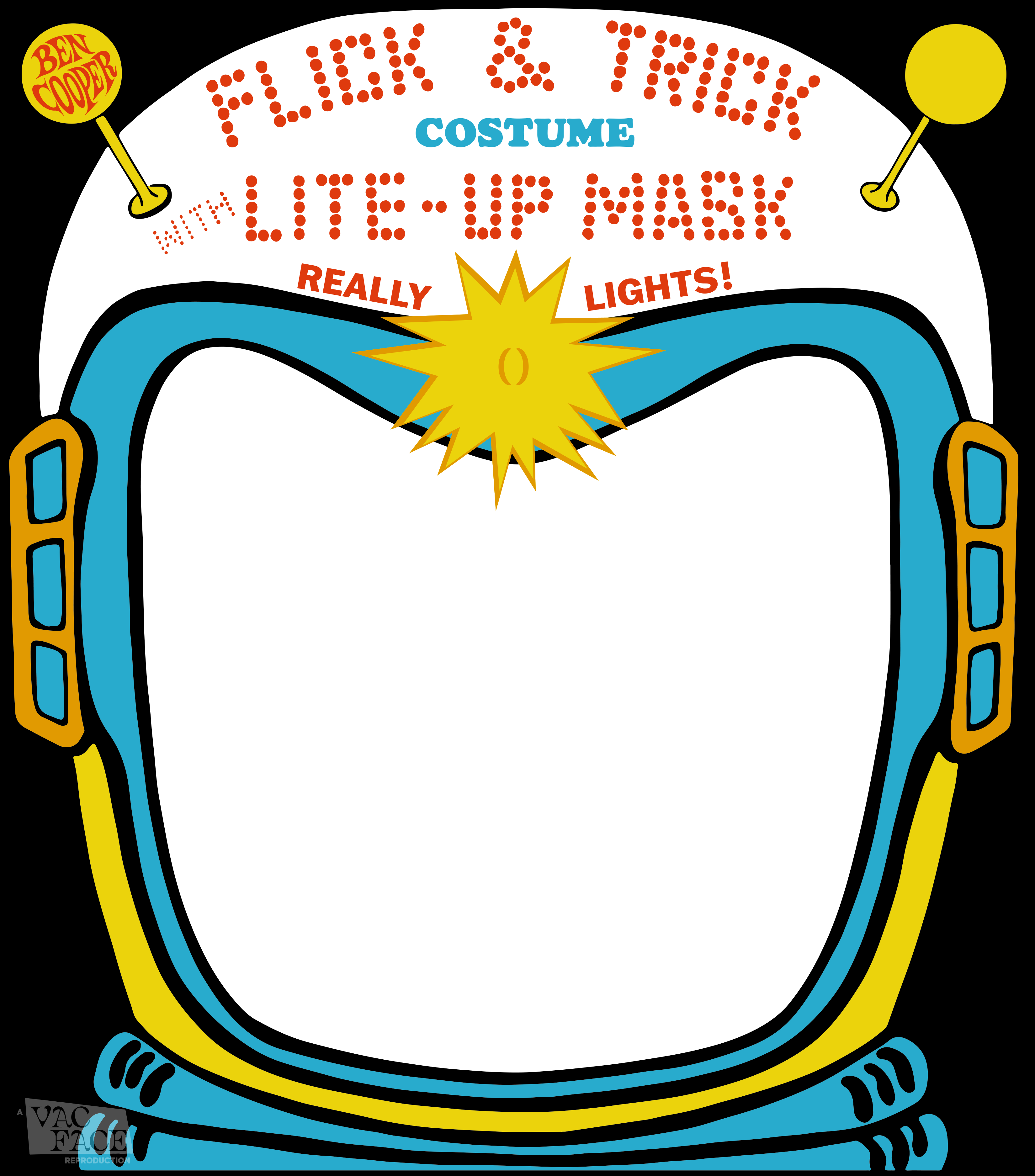 Box for “Lite Up” masks which incorporated battery-powered lightbulbs that could be “flick’d” on and off with a remote.