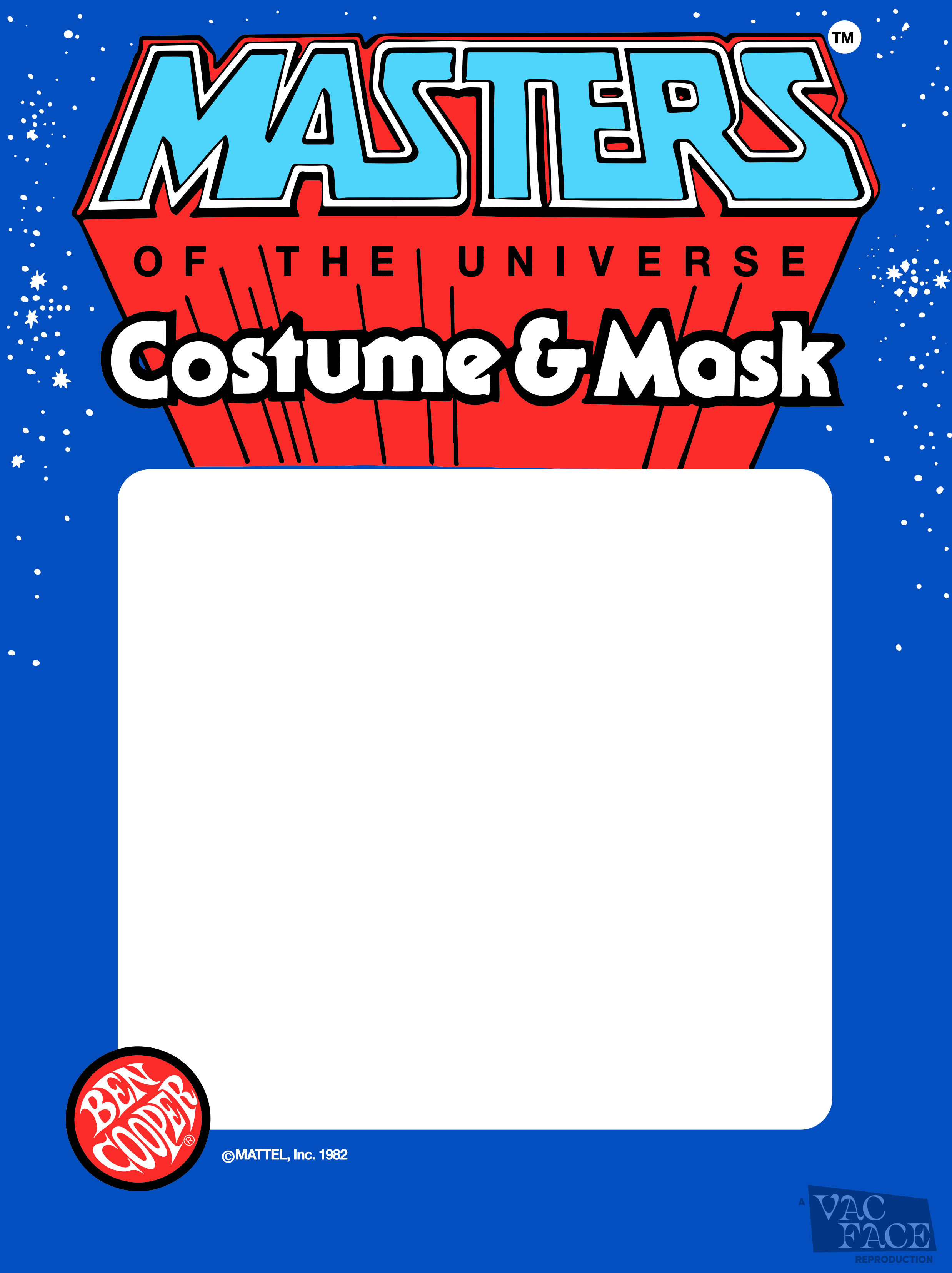 Masters of the Universe Box click for full-size image YEARS: 1982-1985 Box for licensed character costumes from Mattel’s toy line and its accompanying animated series, also known as He-Man. Design Notes: Typefaces: ITC Serif Gothic (redrawn) (“costume & mask”).