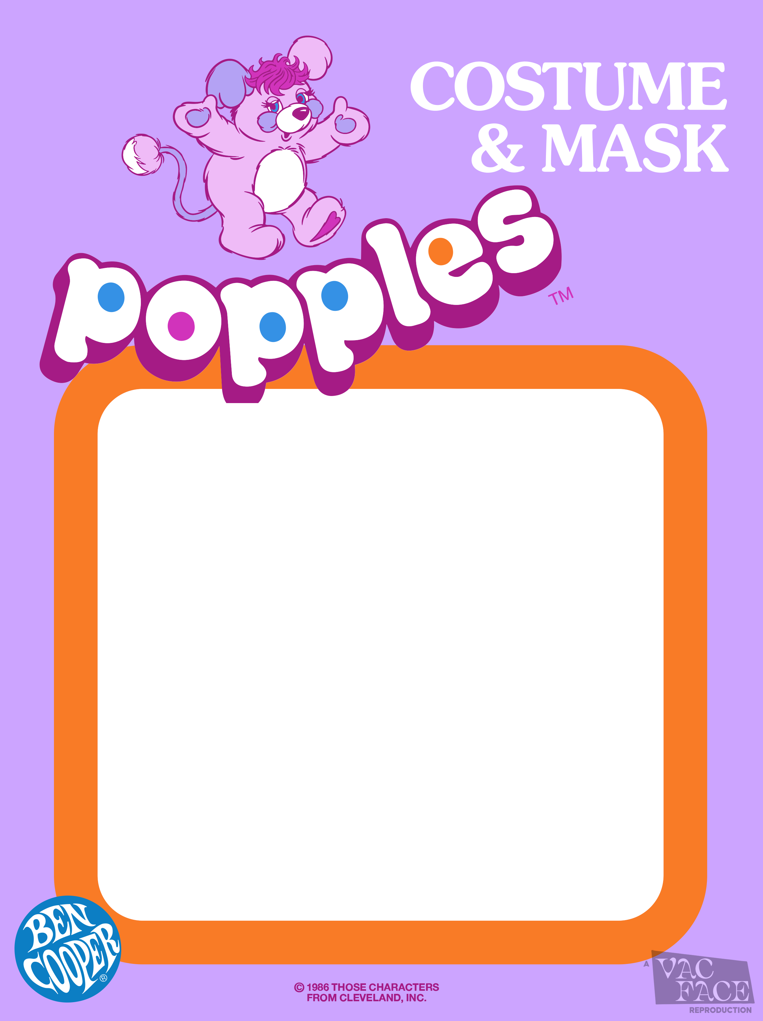 Popples Box click for full-size image YEARS: 1986-1987 Box for licensed character costumes from the animated television series and accompanying toy line. Design Notes: Typefaces: Souvenir (“costume & mask”).