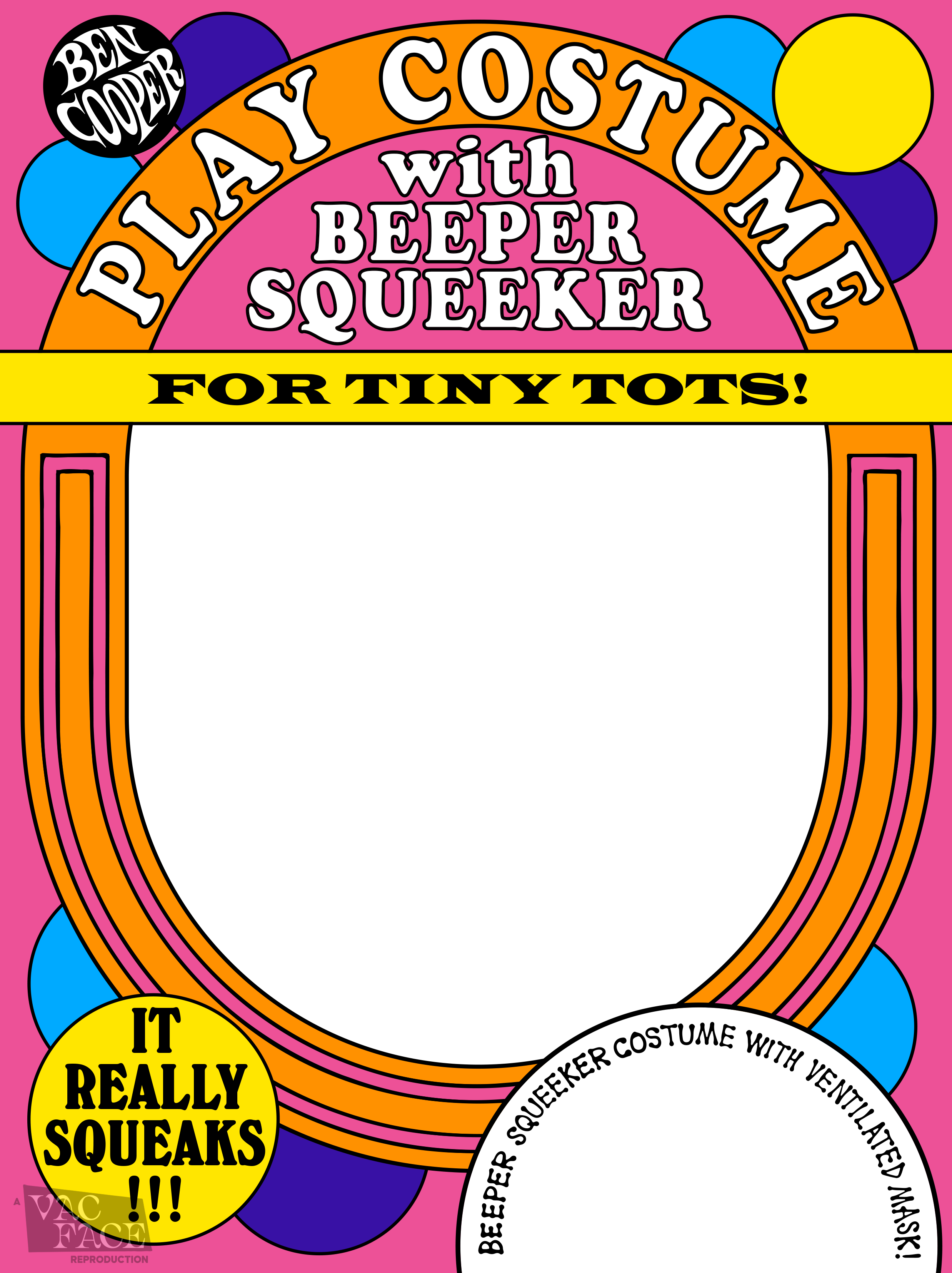 Typefaces: Cooper (“play costume with….”), Windsor (“it really squeaks!!!”), Latin Wide (“for tiny tots!”).